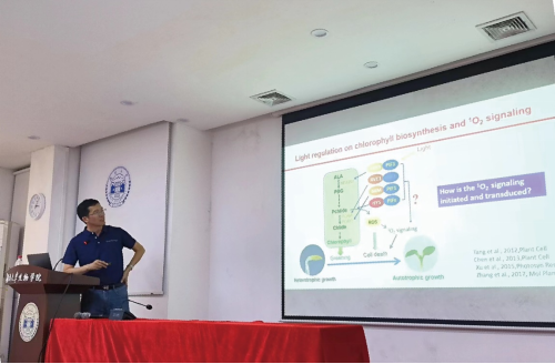 “万物生长靠太阳”,太阳光既为植物光合作用提供能量,也是植物一种重要的环境因子。植物也有“眼睛”,能精确分辨太阳光的波长、方向、强度和周期等信息,并告诉自己如何生长发育去适应环境。林荣呈老师长期从事植物对光的感知、植物如何适应强光等机制研究。在本次报告中,林老师主要围绕植物对强光的响应和适应机制进行讲解。在合成叶绿素的过程中,植物会累积产生Pchlide,但Pchlide的过量积累会产生大量单线态氧,严重影响植物的生存。林老师别出心裁地使用在黑暗中积累Pchlide,接着使用强光照射这一简单的实验设计,筛选出响应单线态氧产生过程的蛋白,并对其机理进行了深入的分析。