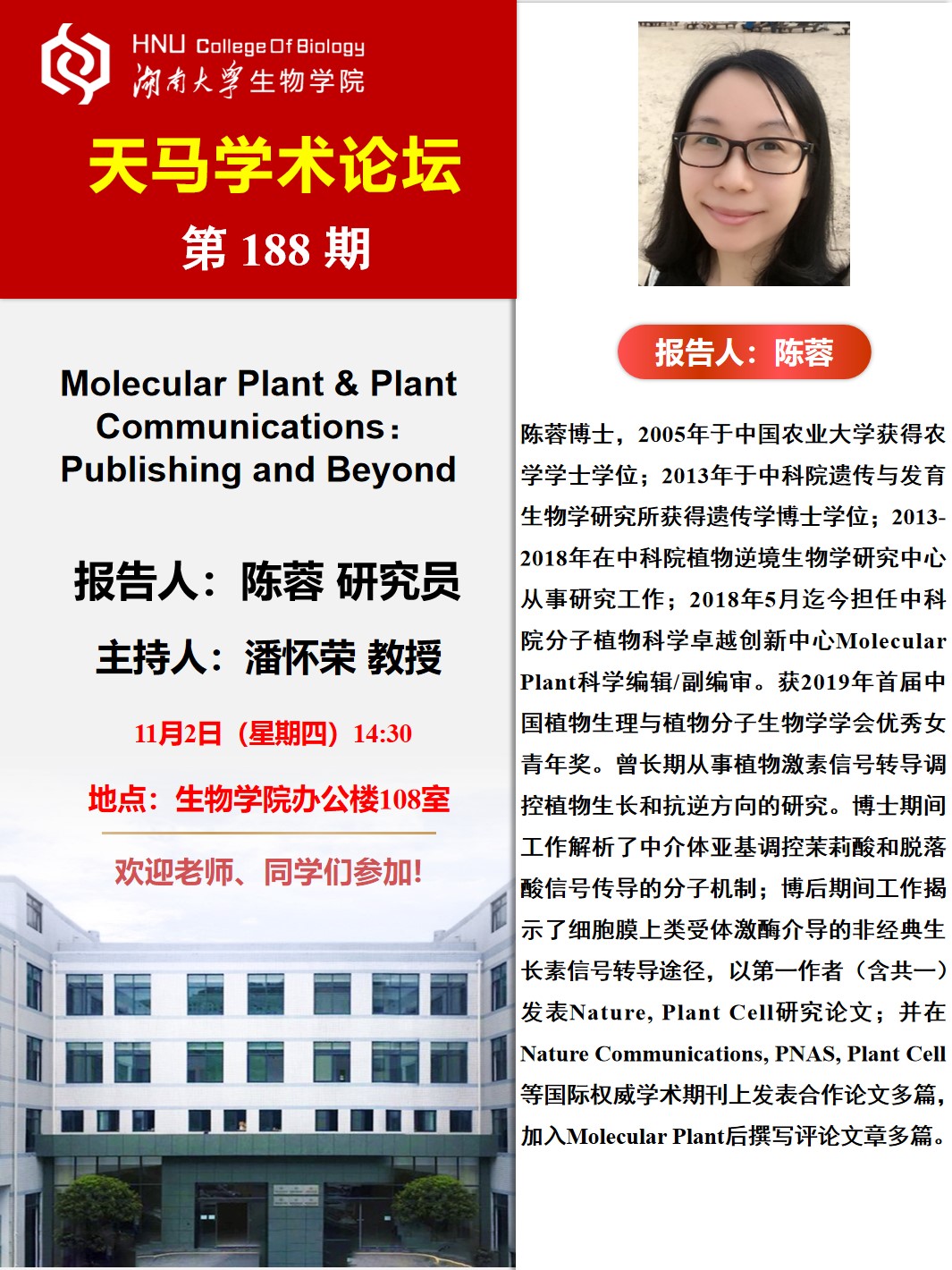 天马学术论坛 第188期-中科院植物逆境生物学研究中心 陈蓉研究员