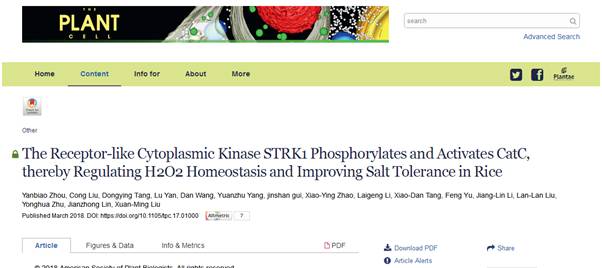 刘选明教授研究团队从水稻中发现了一个耐盐性的类受体胞质激酶(Salt Tolerance Receptor-like cytoplasmic Kinase 1,STRK1),相关研究成果以“The Receptor-like Cytoplasmic Kinase STRK1 Phosphorylates and Activates CatC, thereby Regulating H2O2Homeostasis and Improving Salt Tolerance in Rice”为题于2018年3月27日发表在国际顶尖植物学期刊Plant Cell。周延彪、刘聪、唐冬英和燕璐为论文的共同第一作者,刘选明教授和林建中副教授为共同通讯作者。湖南亚华种业科学研究院杨远柱研究员团队和中国科学院上海植物生理生态研究所李来庚研究员团队参与了部分研究。据查,本论文是湖南省本土水稻基础研究领域首次发表在该期刊的研究成果。