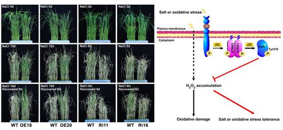 该论文中,研究者通过近5年的研究,成功筛选、鉴定到了一个正调控水稻耐盐性的类受体胞质激酶STRK1,分析了其转基因水稻在盐胁迫条件下的表型,探究了STRK1参与盐胁迫响应的分子机制。结果发现:无论是在幼苗期还是成熟期,STRK1基因沉默株系对盐胁迫更敏感,相反其过表达株系的耐盐性明显提高,并显著降低了盐胁迫造成的产量损失。在耐盐性分子机制研究中发现:当感受到盐胁迫信号时,STRK1首先通过棕榈酰化修饰而锚定在细胞质膜上,STRK1发生自磷酸化,然后再通过将过氧化氢酶C(CatC)的210位点的酪氨酸残基磷酸化而激活CatC的活性,被激活的CatC将由盐胁迫产生的过量过氧化氢(H2O2)降解,从而解除H2O2对细胞的氧化损伤,增强了水稻的耐盐性。此外,还发现水稻经盐胁迫处理后,STRK1和CatC的酪氨酸磷酸化水平显著升高,揭示出在类受体激酶介导的盐胁迫信号转导途径中存在着酪氨酸级联磷酸化的信号转导形式。基于这些结果,研究者提出了一个由STRK1介导的盐胁迫信号转导的新通路(见图1)。刘选明教授团队的研究工作,揭示了类受体胞质激酶STRK1参与盐胁迫响应的分子机制,表明STRK1是一个在耐盐碱作物育种方面有着良好应用潜力的优异基因,对于丰富植物逆境分子作用机制资料和开展盐胁迫下水稻改良具有十分重要的意义。