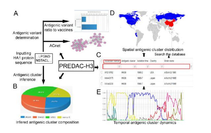 信息科学与工程学院、国家流感中心与中国医学科学院等单位开发了基于基因序列的甲三型流感病毒抗原监测平台PREDAC-H3(见//biocloud.jjwxc2.com/influ411/html/index.php)。该平台不仅能从该病毒的基因序列出发预测病毒发生的抗原变化,而且能实时地展示该病毒的抗原在全球的时空动态变化(其功能如下图所示)。该工作于2016年4月12日在线发表于生物信息学国际顶级期刊《Bioinformatics》,彭友松博士为该论文第一作者,具体见//bioinformatics.oxfordjournals.org/content/early/2016/04/12/bioinformatics.btw185.abstract。该工作的完成有助于提升我国流感疫苗推荐的信息化水平和提高流感疫苗推荐的准确率。
