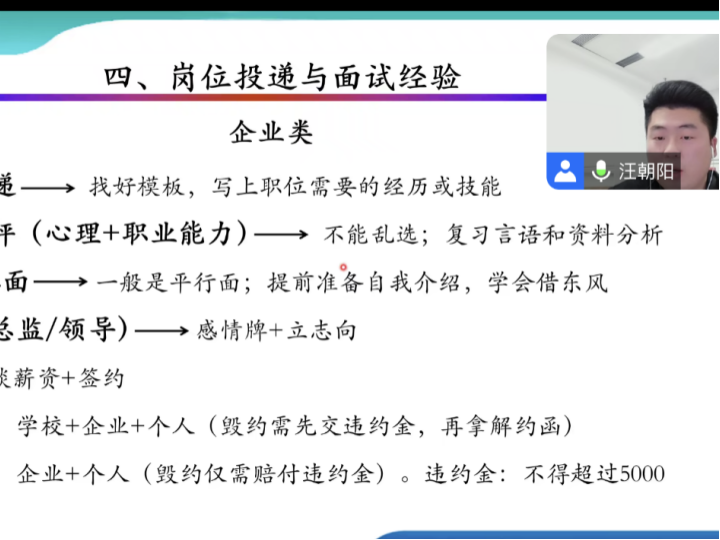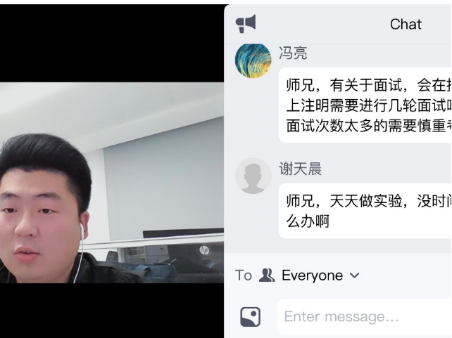 在大家对就业方向有一定基础了解之后,汪朝阳师兄又慷慨分享了自己的求职经验,逐一详尽地分享了简历投递经验、岗位选择经验、以及招聘面试经验,“干货”满满!