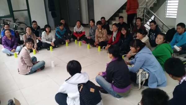 在此之前,班委在班级中征求了迎新晚会集体节目的意见,在初选和全班投票之后,选出了动感十足、轻松有趣的“杯子舞”,生活委员吴雅瑜买好表演用的杯子,这些都为本次练习打好基础,做好准备。下午两点半,同学们陆陆续续从细雨中出现,在略微有些水渍的地砖上坐下开始练习。