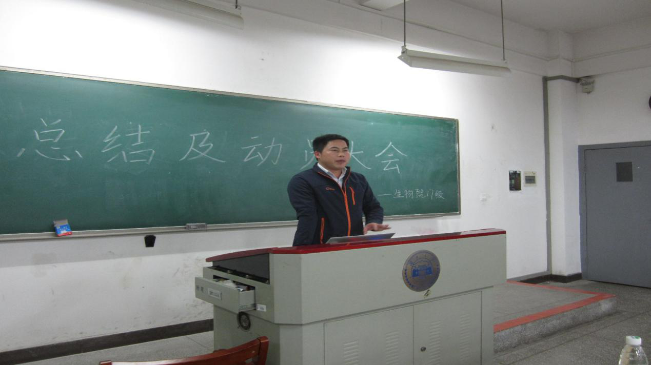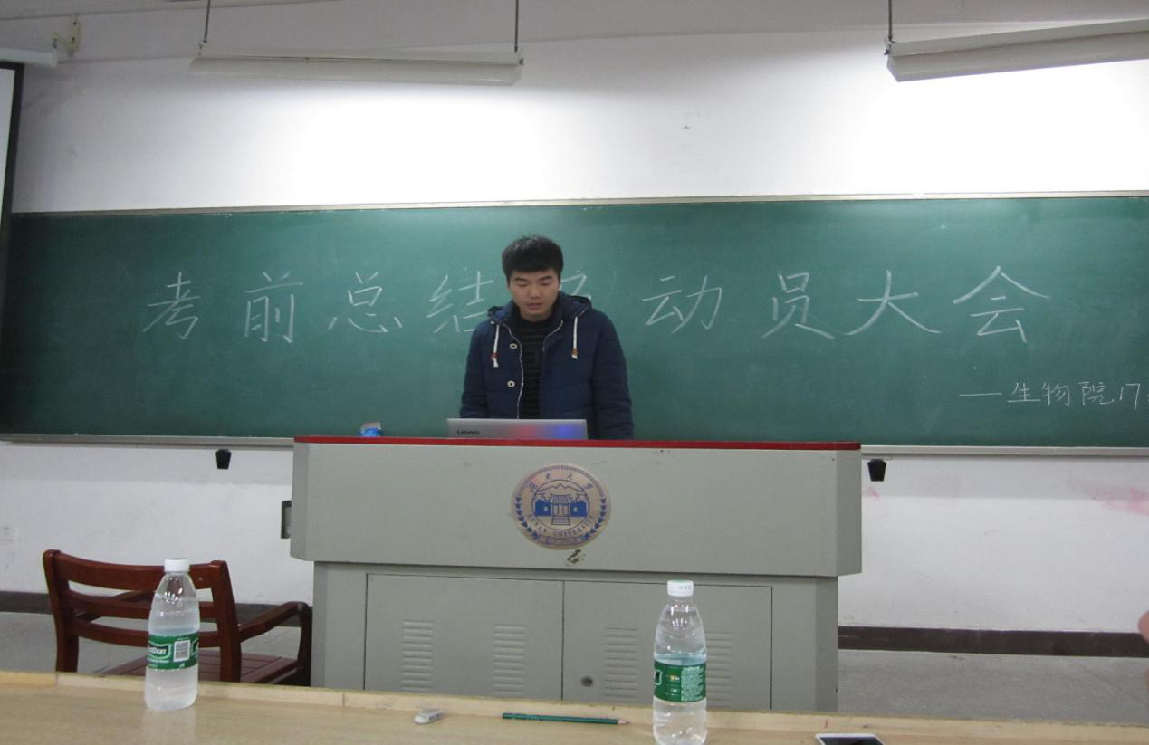 首先主持人介绍了出席会议的老师和本次大会的目的,接着四个班各派了一位代表上台汇报本班这个学期总结和下学期计划。第一个进行汇报的是生物技术1701班李一恒同学,从班级概况、制度、建设、活动、学习与寝室几个角度对本班第一学期的情况做了回顾与总结,详细介绍了班级的近期计划和未来展望。