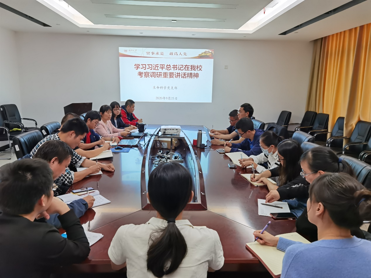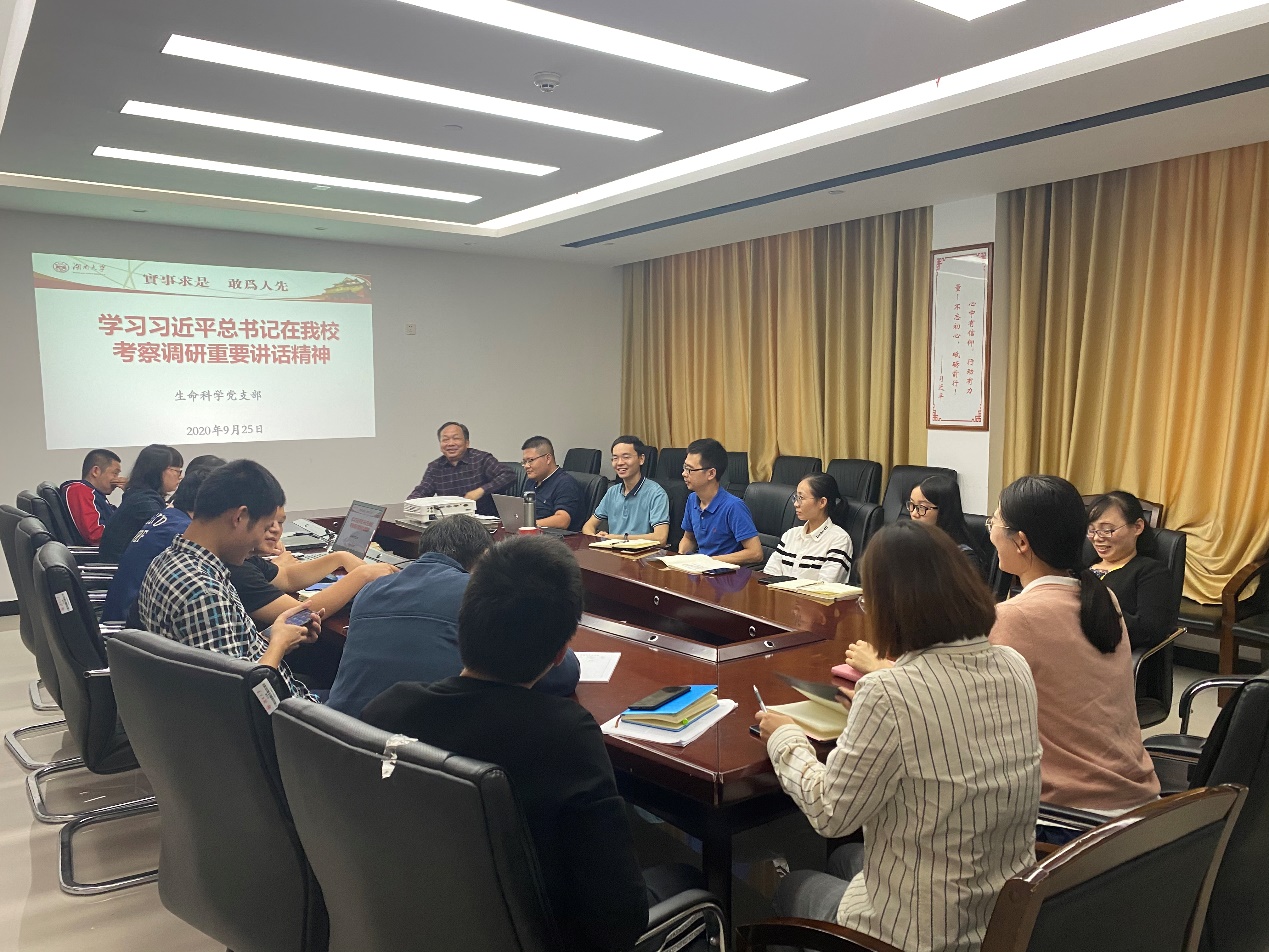 考察调研,是对我们全体湖大人的激励,我们每一名老师更应该做好自己本职工作,在教书育人、科研创新上做出自己的贡献。支部成员龙樱博士后发言讲到,习总书记专门讲到“唯楚有才,于斯为盛”,作为一名湖南人,作为曾国藩的老乡,我对此更有着深刻体会,在博士后的阶段,更应该做好科研本职工作,为中国梦的实现贡献自己的力量。支部成员郭新红教授发言谈到,自己为习总书记到来深受鼓舞,作为党员教师,要首先把教书育人做好,还要按照习总书记四个面向的要求,做好科研工作。支部成员姚瑞枫教授发言强调,作为一名青年教师,对于习总书记的到来深感激励,我们更应该响应习总书记要求,在立德树人、教书育人上下功夫,不断学习掌握教学技能技巧、同时保持对于科研的一颗好奇心,在教学和科研上做出更多更好的成果。支部成员刘选明教授发言讲到,习近平总书记视察湖南,充分表明了总书记对于湖南的重视,无论从这次新冠疫情还是从历史的各个重大事件都可以发现,我们湖南,我们湖南人在关键时期靠得住。我们更应该继续这种优良传统,为祖国培养出优秀的接班人。