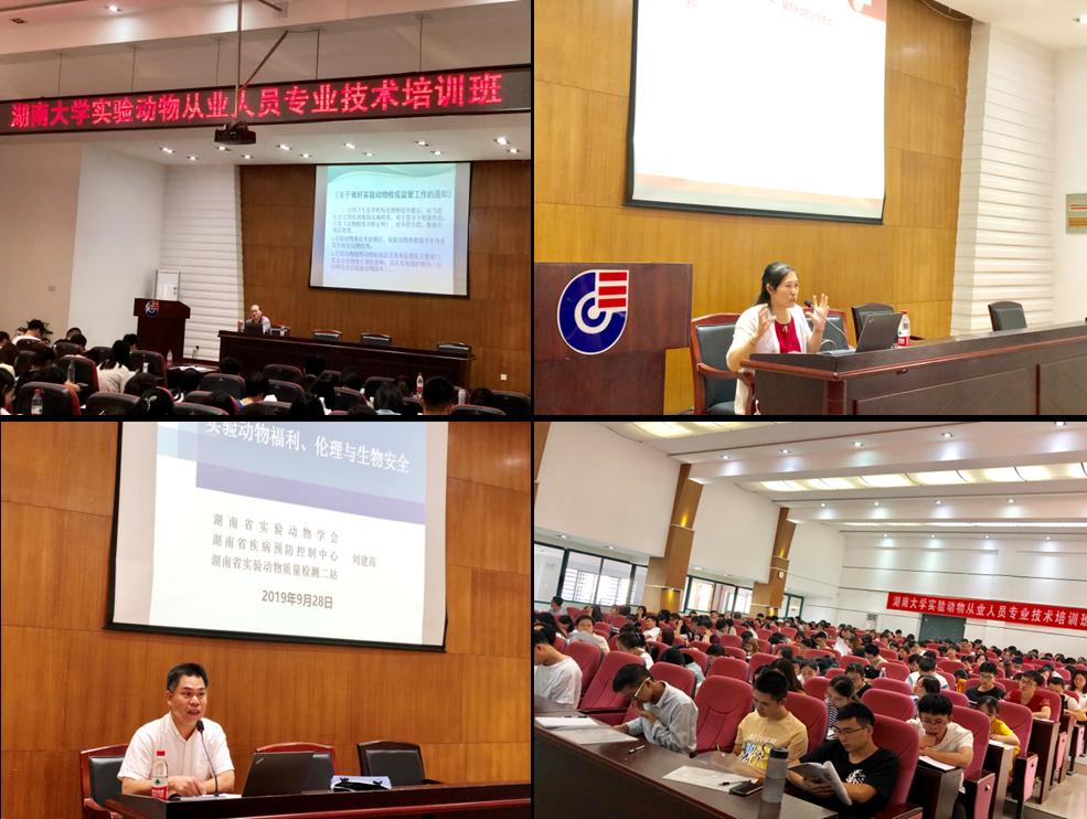 聂和民教授主持,聂教授首先介绍了实验动物对人类医学与健康研究做出的巨大贡献,呼吁大家更好地利用实验动物,提高实验室动物福利,充分体现每一只实验动物的价值。此次培训班特别邀请了湖南省动物管理办公室主任李彧章,李主任就相关实验动物管理法规做了详细介绍,指导实验动物从业人员的规范操作。随后,湖南中医药大学余望贻教授介绍了常用实验动物的生物学特点与饲养管理,提高实验人员的操作技能。湖南省动物管理办公室刘建高教授就实验动物福利、伦理、以及生物安全做了详细介绍,指导实验人员规范操作,注意个人及环境安全防护。最后,中南大学湘雅医学实验动物学部周智君教授介绍了实验动物设施的使用和管理相关的知识。培训最后环节,所有学院参加了从业资格考试,旨在考查学员对此次培训知识的掌握情况,提高实验动物从业人员的综合素质。