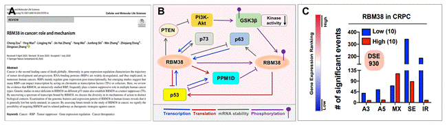 图1. RBM38在癌症中的作用机理。(A)发表的文章截图。(B) RBM38与p53家族成员之间的复杂调节网络。(C) RBM38与治疗抵抗的恶性前列腺癌有关:其高表达会大幅度地抑制癌症RNA的剪切。