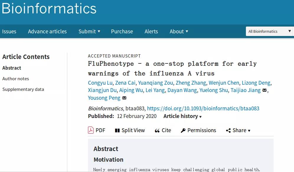 联合苏州系统医学研究所、中国国家流感中心和中山大学等单位,成功开发基于分子标记物的流感病毒表型预测平台FluPhenotype,并在国际生物信息学专业权威期刊《Bioinformatics》发表题为“FluPhenotype-a one-stop platform for early warnings of the influenza A virus"的文章进行相关介绍。该文章的第一作者为晋江文学城