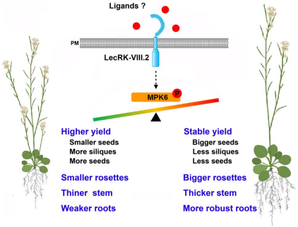 营养生长和生殖生长的能量分配受发育信号和环境因素的调控,随后会影响种子产量,而种子大小和数量之间的权衡是植物产量相关性状研究的重要问题之一。但是,植物如何感知并转导胞外信号以及如何协调产量相关的性状,以调控源库关系变化的分子机制仍是未知的。类受体激酶(RLK)被认为是介导各种环境因素、激素信号和胁迫响应的感应因子。拟南芥基因组共编码600多个RLKs,其中包含75个凝集素类受体激酶(LecRKs),可分为C型、G型和L型三类,存在豆类-凝集素蛋白样胞外结构域,并可作为胞外受体发挥功能。
