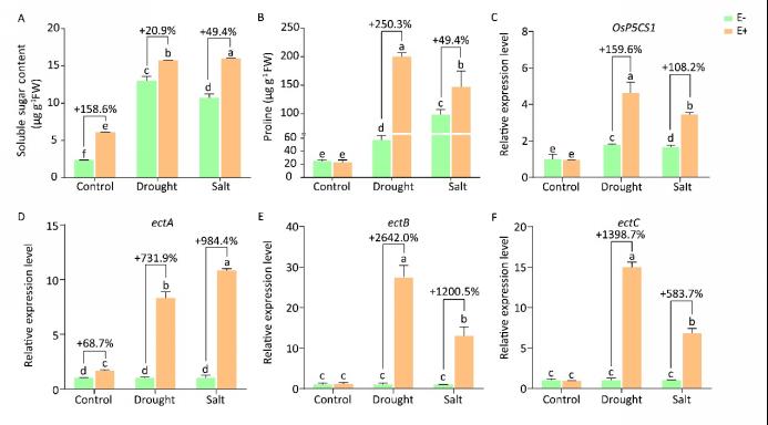 研究者在温室和田间试验中均证实OsiLf-2定殖水稻后,不仅能提高水稻幼苗的抗旱和耐盐能力(图1),还能有效降低盐碱土壤对水稻产量的不利影响。在温室中,干旱和盐胁迫条件下,与对照组(未接种内生菌OsiLf-2,E-)相比,接种了内生菌OsiLf-2(E+)的水稻幼苗的干重分别显著提高了62.5%和60.3%;在盐碱大田中,E+水稻较E-水稻的单株产量、千粒重和有效分蘖数分别显著提高了62.0%、4.7%和58.4%。研究发现,OsiLf-2是一株中等耐盐菌,能够产生丰富的渗透调节物质,如脯氨酸和四氢嘧啶。在20% PEG和150 mmol L−1NaCl分别处理后,OsiLf-2产脯氨酸的能力可提高21.6%和38.4%,四氢嘧啶的产量由1.3 mg g−1提高至213.7 mg g−1。在水稻体内,E+组的脯氨酸和可溶性糖含量较E-组均显著提高,最大增幅可达250.3%,水稻自身的脯氨酸合成基因OsP5CS1表达水平显著提高了159.6%。而OsiLf-2的四氢嘧啶合成基因ectA,ectB,ectC均大量诱导表达,增幅高达26.4倍(图2)。上述结果表明,OsiLf-2在宿主体内除了通过自身产生脯氨酸和四氢嘧啶等渗透调节物质,还能诱导水稻合成大量渗透调节物质,从而增强宿主对干旱和盐胁迫的耐受能力。此外,OsiLf-2还能诱导水稻胁迫响应和离子转运相关基因的表达水平,提高水稻抗氧化系统相关酶的活性,并促进叶绿素合成、增强光合作用效率,最终通过提高宿主在逆境条件下的生存能力以保障其有效产量。