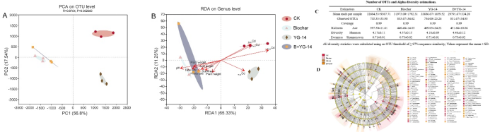 图2.A.植物株高与根长;B.植物地上与地下部分干重;C.植物总叶绿素含量;D.植物叶片氮含量;E.植物净光合速率。CK:未经过处理的刺槐;Biochar:施加生物炭处理的刺槐;YG-14:接种YG-14处理的刺槐;B+YG-14:YG-14复配生物炭处理的刺槐。