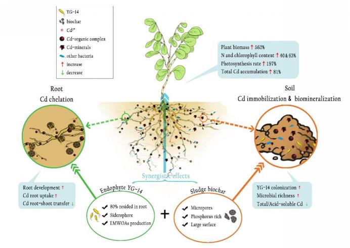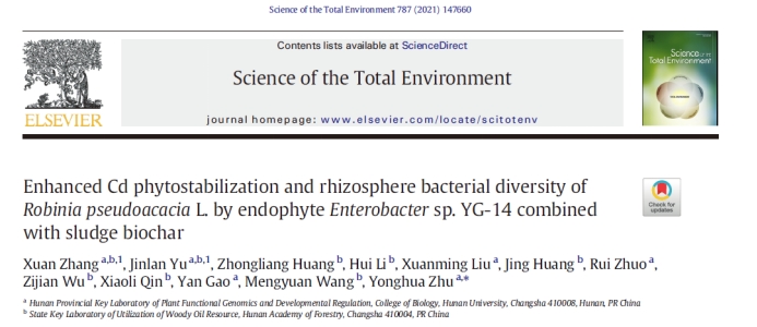 和湖南省林业科学院的最新合作研究成果“Enhanced Cd phytostabilization and rhizosphere bacterial diversity ofRobinia pseudoacaciaL. by endophyteEnterobactersp. YG-14 combined with sludge biochar”。研究构建了一种新型的植物内生菌-污泥基生物炭-木本植物刺槐联合修复技术,用于土壤重金属镉污染的植物固定化,土壤镉浓度和有效态可降低61.75%和69.01%,并表现出显著的植物促生效果,土壤改良和微生态改善明显,具有广阔的应用前景。