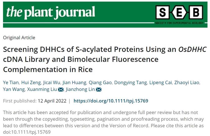 刘选明教授和林建中副教授团队在植物学TOP期刊The Plant Journal(IF5-y=7.666)在线发表题为“Screening DHHCs of S-acylated Proteins Using anOsDHHCcDNA Library and Bimolecular Fluorescence Complementation in Rice”的研究论文。该论文建立了一种快速筛选鉴定S-酰化蛋白的相关DHHC蛋白的方法,并且发现OsDHHC30通过S-酰化修饰OsCBL2/3参与调控水稻的耐盐性。