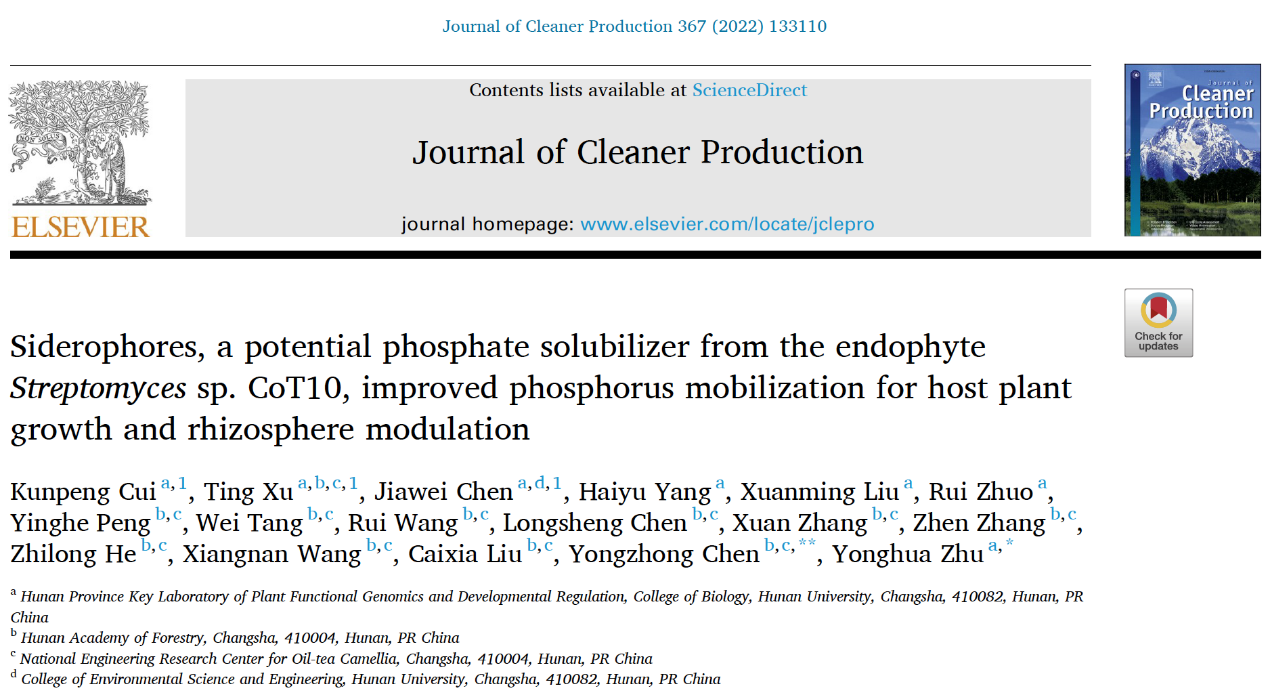 朱咏华教授团队与湖南省林业科学院陈永忠研究员团队合作在中科院一区TOP期刊Journal of Cleaner Production(IF: 11.072)发表题为“Siderophores, a potential phosphate solubilizer from the endophyteStreptomycessp. CoT10, improved phosphorus mobilization for host plant growth and rhizosphere modulation”的研究论文。该研究首次证实了内生链霉菌CoT10通过产生铁载体来直接介导铁结合态难溶磷的活化效应,揭示了内生菌促进宿主植物生长和磷素高效利用的新的作用机制。此研究成果为调控富铁土壤中磷素的动员与活化提供新的思路,丰富植物磷养分吸收利用调控机制的科学理论,为推动内生放线菌在植物营养领域的广泛应用、开发新型微生物肥料奠定理论基础。
