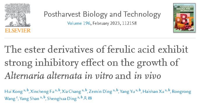 链格孢菌(Alternaria alternata)是自然界中普遍存在的一种破坏性真菌,生长繁殖快,产孢能力强。它可以侵染柑橘、苹果、梨、红枣、黄桃和番茄等多种水果和蔬菜,引起果蔬采后贮运过程中发生黑斑病腐烂,造成巨大的浪费和经济损失。此外,链格孢菌在生长繁殖过程中还会产生多种真菌毒素,主要包括链格孢酚、链格孢甲基醚、细链格孢酮酸、链格孢霉烯和腾毒素等,其中一些真菌毒素对动物和人类具有诱变和致癌作用。长期使用化学杀菌剂不仅对食品安全和人体健康有害,还会污染环境、导致病原菌产生耐药性。因此,开发安全、高效的天然抑菌剂来控制黑斑病的发生具有重要意义。近日,单杨院士团队丁胜华副研究员在阿魏酸酯化衍生物抑制果实采后链格孢菌体内外生长方面取得进展,相关成果以“The ester derivatives of ferulic acid exhibit strong inhibitory effect on the growth ofAlternaria alternata in vitroandin vivo”为题发表在农林科学领域一区TOP期刊Postharvest Biology and Technology(IF:6.751)上,晋江文学城