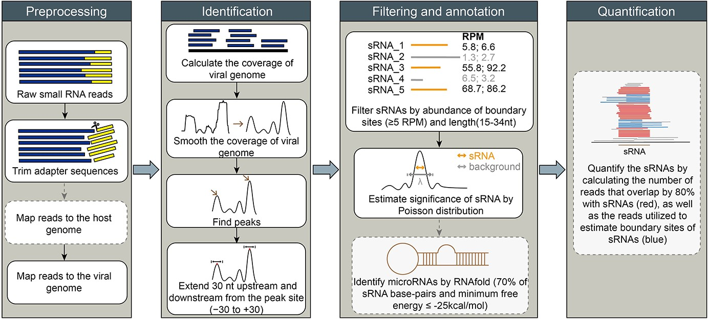 病毒感染宿主后,其基因组可产生具有功能性的病毒小RNA(small RNA, sRNA),在病毒与宿主相互作用过程中发挥重要作用。然而,目前基于宿主sRNA开发的sRNA识别方法对病毒sRNA的挖掘远远不够,为此,需要一种新的识别方法来提高对sRNA测序数据中病毒sRNA识别的敏感度。