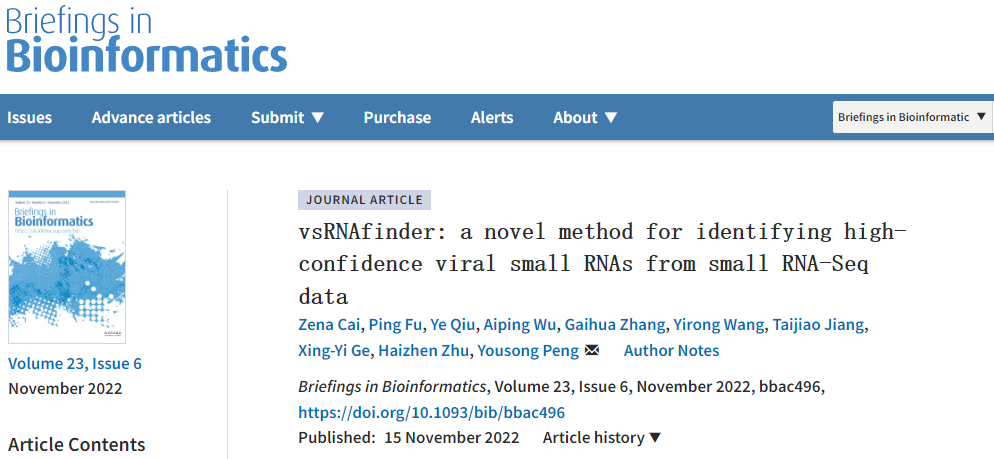 Zena Cai, Ping Fu, Ye Qiu, Aiping Wu, Gaihua Zhang, Yirong Wang, Taijiao Jiang, Xing-Yi Ge, Haizhen Zhu, Yousong Peng, vsRNAfinder: a novel method for identifying high-confidence viral small RNAs from small RNA-Seq data, Briefings in Bioinformatics, bbac496, //doi.org/10.1093/bib/bbac496