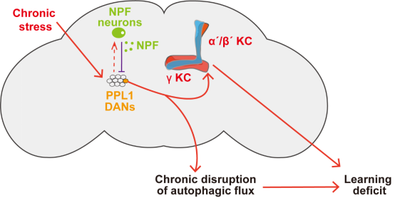 本研究结合使用转录组学、分子生物学、遗传学、药理学和行为学等手段探究CSLD发病的分子和神经机制。论文首先通过时间序列转录组分析慢性应激处理过程中的基因表达变化,发现慢性应激会改变细胞自噬-溶酶体通路相关基因的表达。随后的一系列实验结果表明慢性应激会诱导自噬流的阻断,而慢性自噬流阻断促进了CSLD的发生发展。这一发现在一个无脊椎动物模型里面首次证明了细胞自噬后期阶段的阻断是抑郁相关认知障碍的病因。其次,本研究通过无偏见的突变体筛选发现神经肽F(NPF)(果蝇神经肽Y的同源物)能够维持正常细胞自噬流,促进对CSLD的抗性。操纵NPF神经元的实验结果证实了NPF的重要作用。此外,本研究还发现NPF能系统是通过抑制应激诱导的多巴胺能活性来维持细胞自噬流,促进CSLD抗性的。这为抑郁症相关认知障碍的病因学提供了一种新的潜在机制性见解。