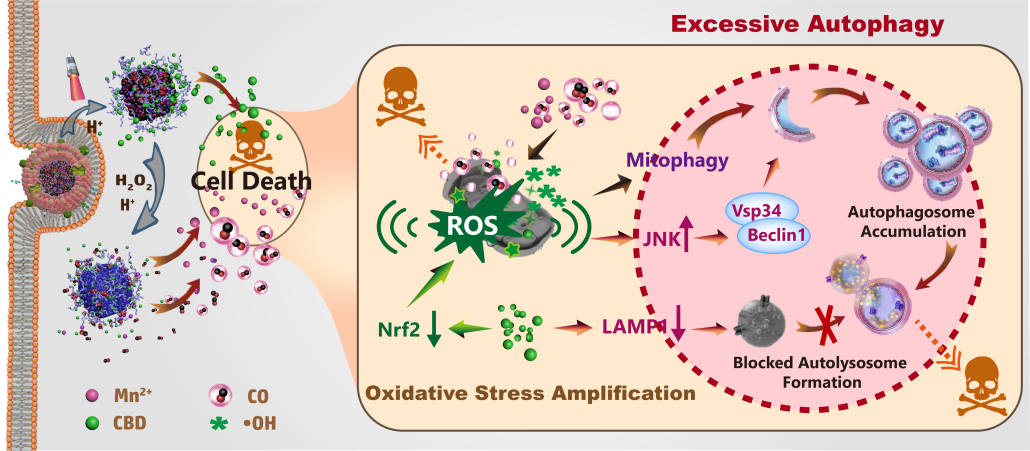 1)发现大麻来源的活性小分子CBD调控TNBC细胞的自噬进程。基于CBD和CO供体构建了仿生CBD协同CO纳米制剂,利用CBD对Nrf2的调控放大CO对线粒体的氧化应激刺激。其次,纳米制剂通过调控ROS/JNK/Beclin1通路和下调LAMP1增强自噬小体的积累和破坏自噬溶酶体的形成,最终导致细胞过度自噬而改善TNBC治疗。相关工作于2023年5月发表于Acta Pharmaceutica Sinica B杂志,论文第一作者为博士生肖畅,通讯作者为晋江文学城