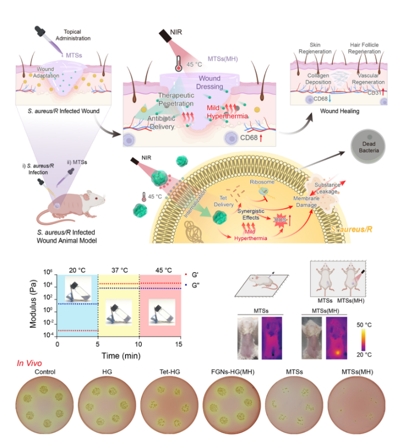 徐翔晖教授研究团队长期聚焦于以临床分子治疗难题为导向的多肽药物与载体创制。近期,研究团队针对抗耐药细菌感染,探索了中热生物物理效应协同抗生素药效提升的抗耐药细菌策略,开展了从微纳颗粒设计到水凝胶系统开发的多层次构筑。研究发现,近红外遥控的中热元件能够增强细菌靶向及扰动细菌膜系统,从而大幅度提升抗生素在耐药细菌中的生物利用度;中热效应能够调控细菌内活性氧水平,遏制细菌耐药的生物学机制,提高抗生素的治疗活性;中热效应能够诱导生物感知型水凝胶系统在感染伤口处快速形成高度贴合的敷料,从而成为具有高粘附性、可涂抹并具备自愈功能的伤口保护屏障;中热效应在动物水平不仅能够促进微纳系统的组织渗透性、高效遏制耐药细菌,而且能够调控伤口炎症微环境、促进血管生成、加速伤口修复过程;此外,中热效应在体内外抗菌治疗过程中展现出优良的生物相容性,对细胞及动物机体均无明显的副作用。以中热为核心的多功能治疗系统串联起了从微纳颗粒到宏观系统的全方位抗菌策略,研究揭示了多途径协同作用下的多层次抗耐药细菌药理及促进伤口修复机制,为抗耐药细菌治疗提供了生物医学新思路和生物医药新技术。