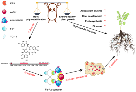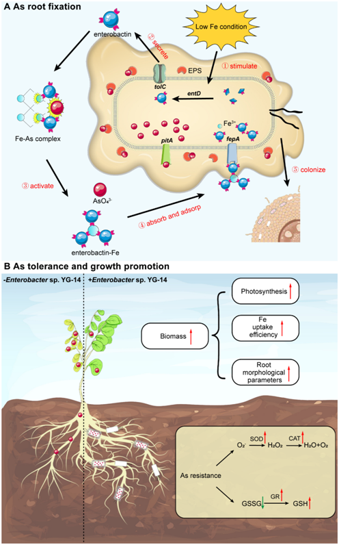 和湖南省林业科学院的最新合作研究成果“EndophyticEnterobactersp. YG-14 mediated arsenic mobilization through siderophore and its role in enhancing phytostabilization”。研究通过构建YG-14铁载体—肠杆菌素合成基因缺失突变体(ΔentD),证实内生菌通过分泌铁载体有效促进了矿物土壤中铁砷络合物的活化,释放可被生物利用的铁和砷到根际中,进一步通过胞外聚合物和特定的磷酸酶转移蛋白PitA吸附和吸收环境中的砷,最终通过定殖的方式将环境中的砷固定在修复植物根部,实现土壤砷污染植物根部固定修复。研究从表型、生理生化和分子水平揭示了内生菌在促进修复植物固定砷和维持宿主植物生长中的重要作用。