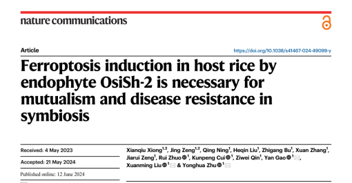 朱咏华教授团队在中科院一区TOP期刊 Nature Communications(IF:16.6)上发表了题为“Ferroptosis induction in host rice by endophyte OsiSh-2 is necessary for mutualism and disease resistance in symbiosis”的研究成果。该研究首次揭示了内生放线菌OsiSh-2通过诱导水稻适度铁死亡的发生促进其与宿主共生平衡,同时激活宿主免疫进入“防御警备”状态,增强共生体抗病性的作用机制。