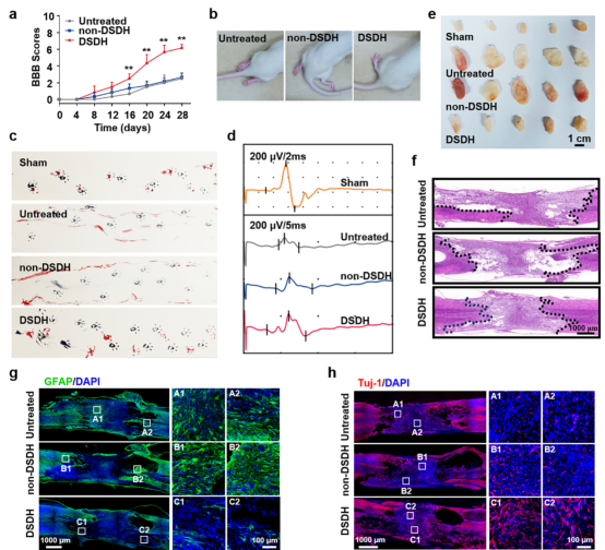 研究结果表明,该序贯治疗体系在时序性免疫调控和功能修复方面均展现出显著优势。在损伤后第7天,水凝胶有效抑制了M1型标志物iNOS的表达;至第28天,显著提升了M2型标志物CD206的水平,成功实现了从早期抑炎到后期促修复的免疫转变。功能学评估显示,经双药序贯水凝胶治疗的大鼠,其后肢运动功能(BBB评分)、步态协调性及运动诱发电位信号均明显改善。同时,该策略有效缓解了脊髓损伤常见并发症——膀胱功能障碍,显著减少了损伤区空腔形成与胶质瘢痕生成,并促进了神经元标志物Tuj-1的表达和神经纤维再生。