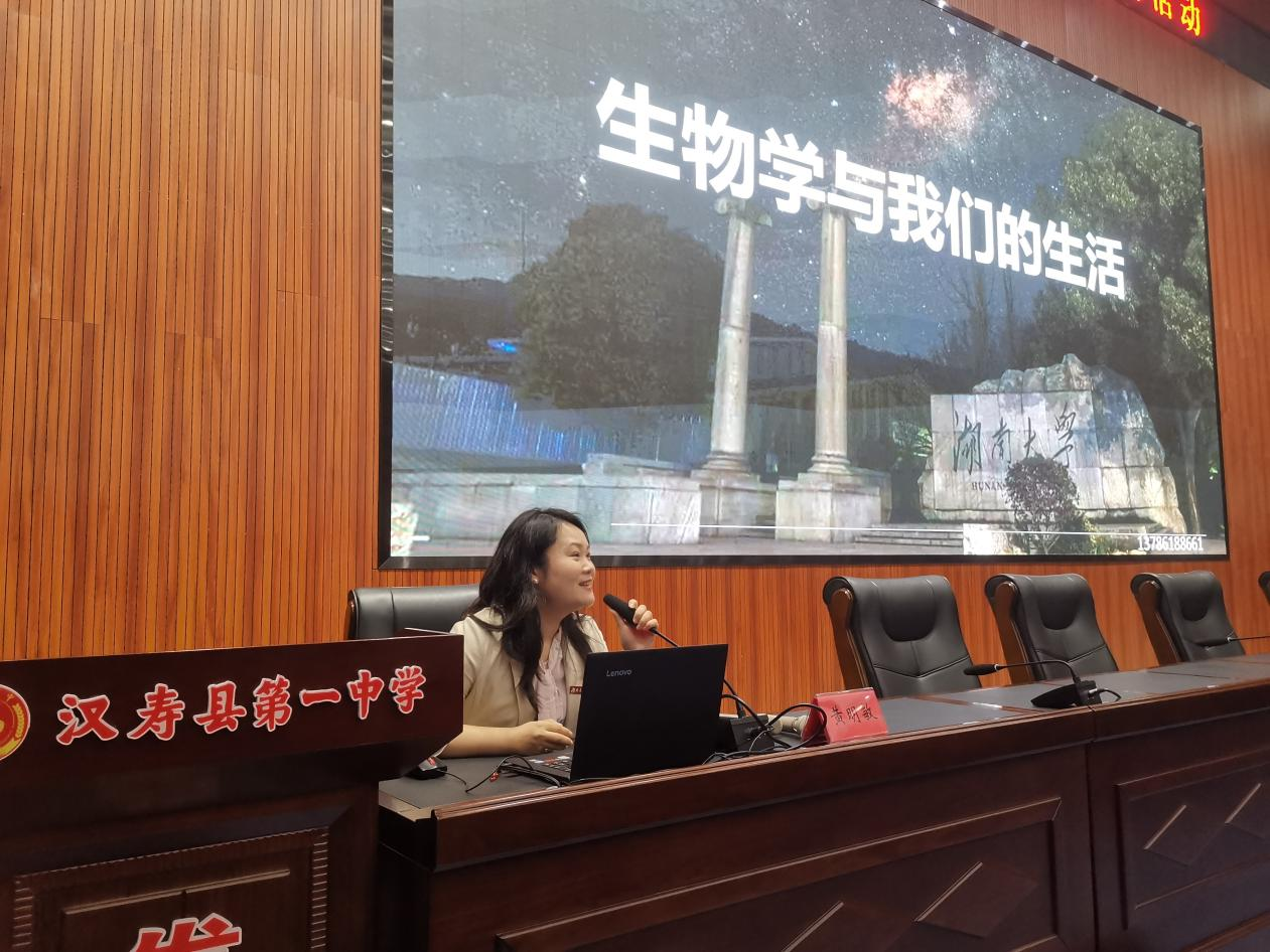 副教授黄明敏、辅导员于淼漪一行到常德汉寿县第一中学、安乡县第一中学进行招生宣讲活动,为两所中学学生开展“生物学与我们的生活”主题讲座,活动覆盖千余名学生。